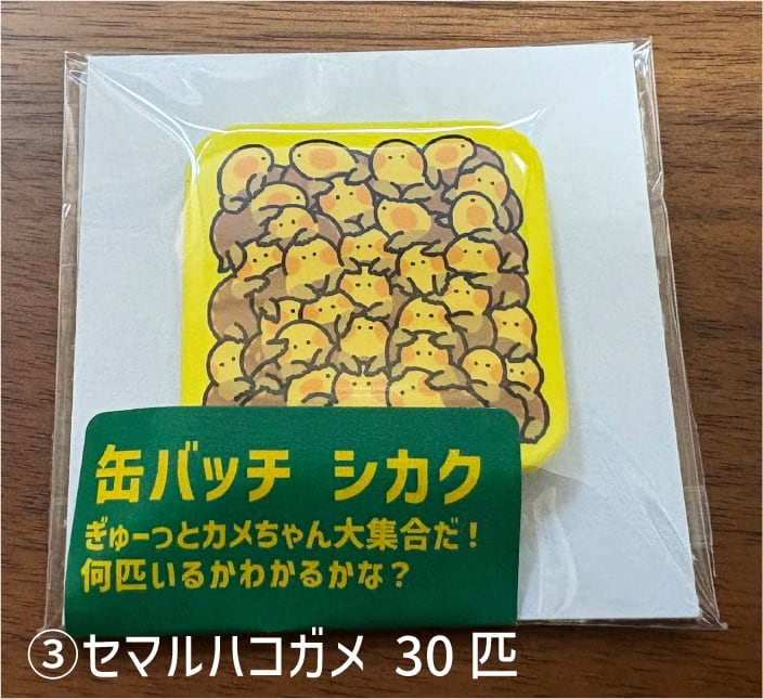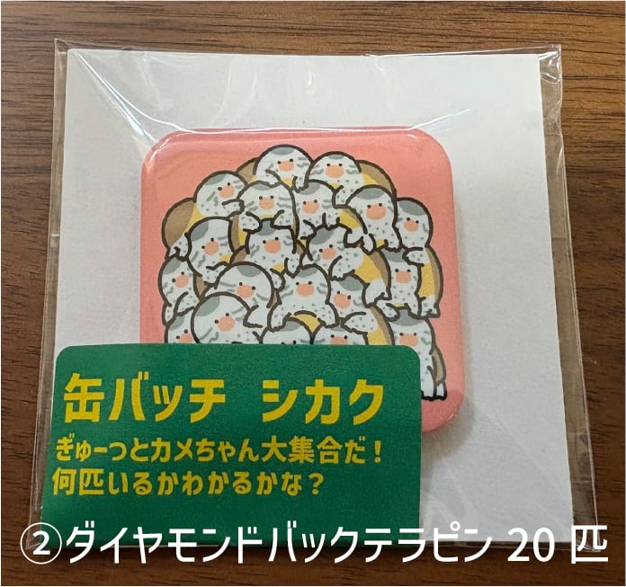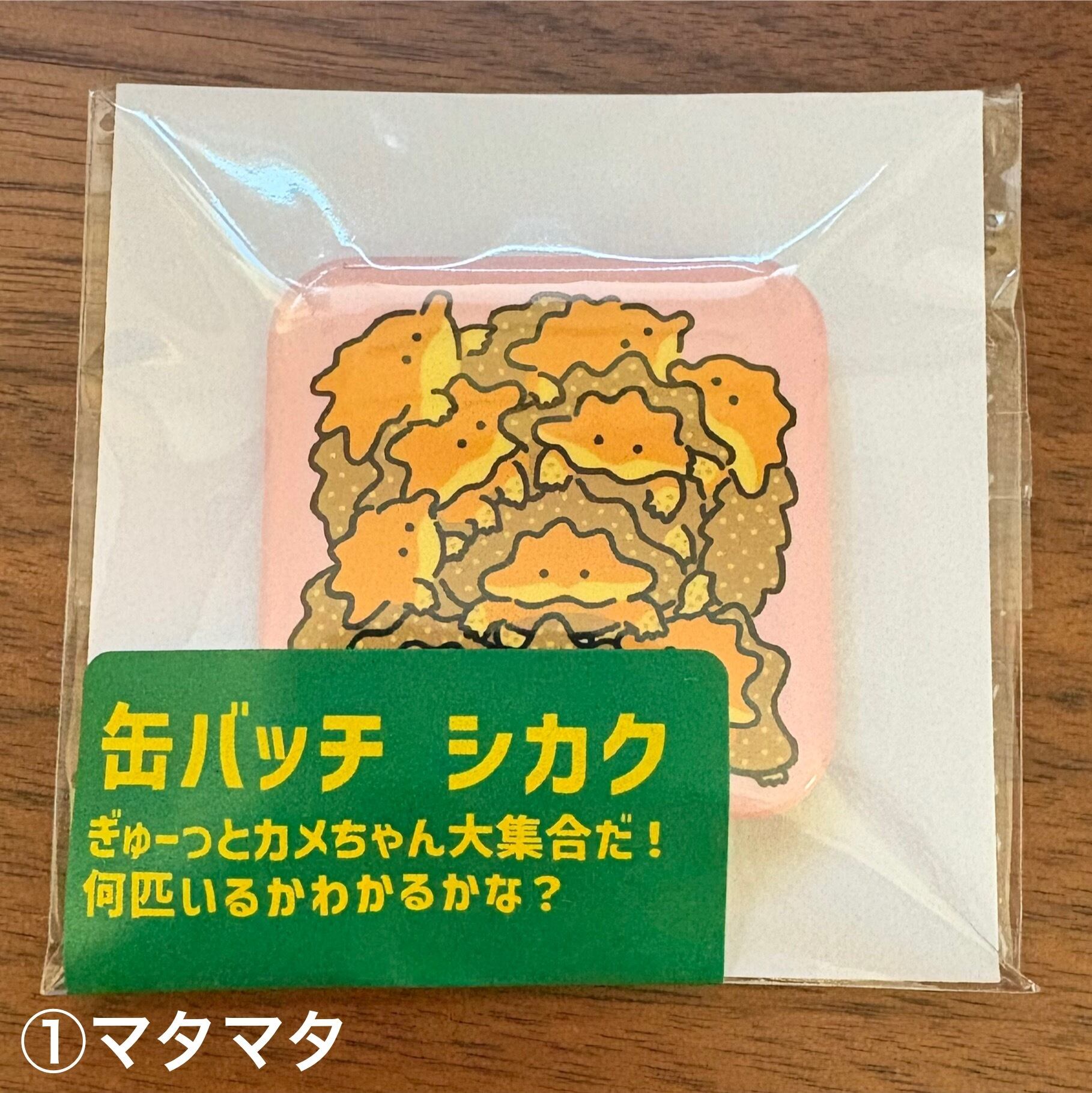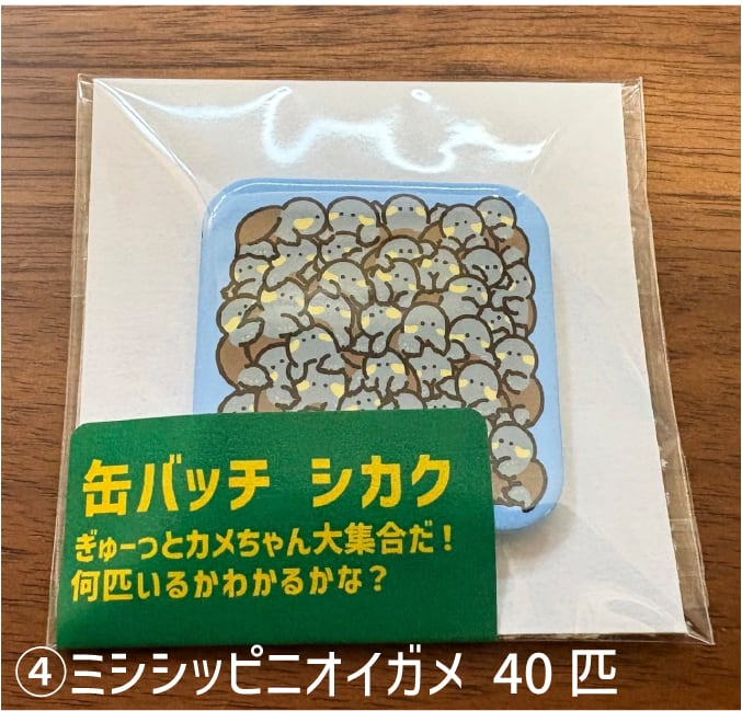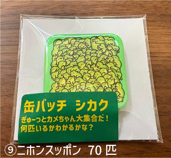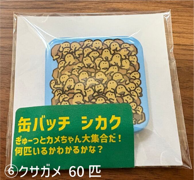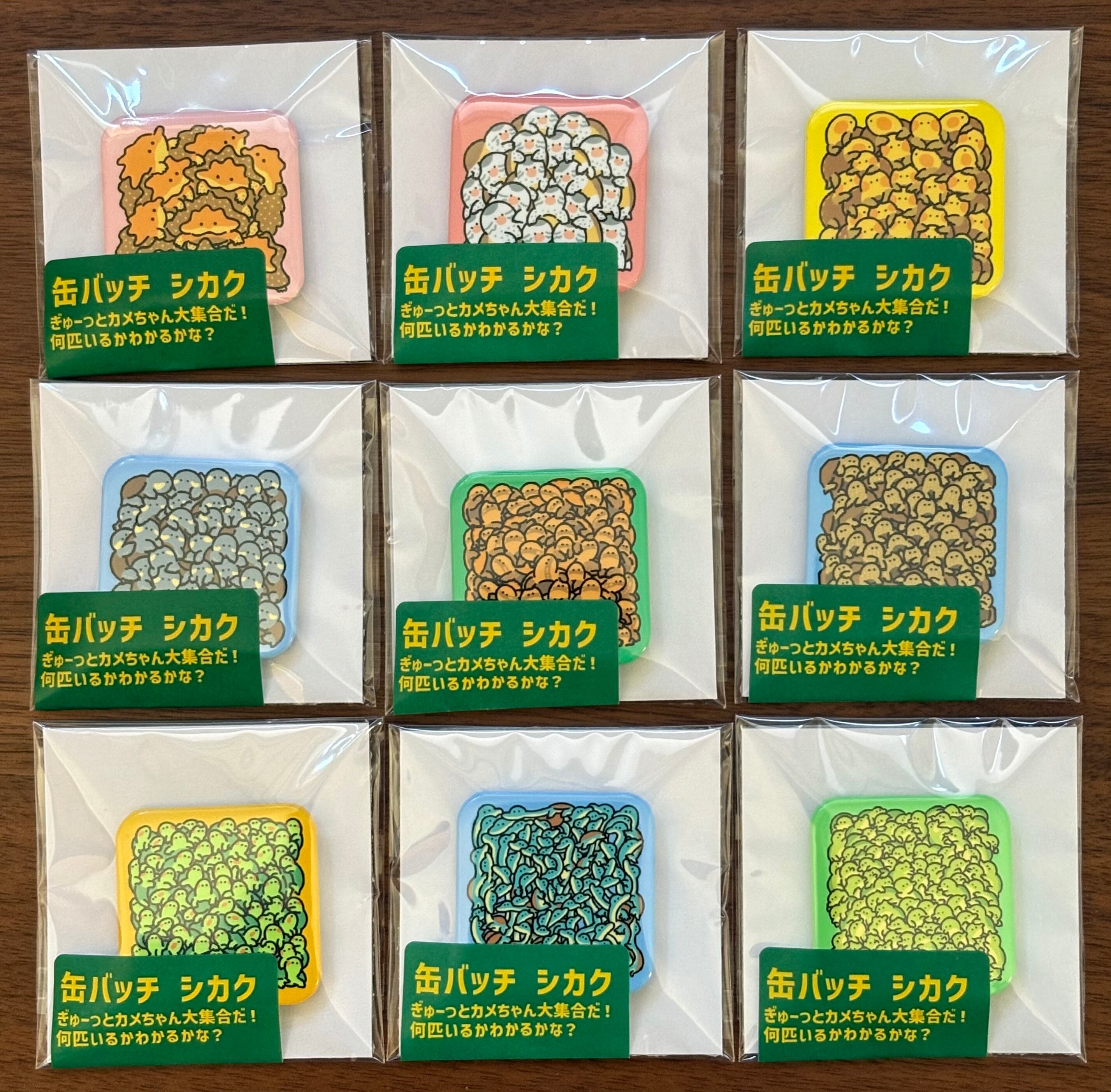 増えていくカメたちがデザインされた、ちょこんと可愛い缶バッチ。