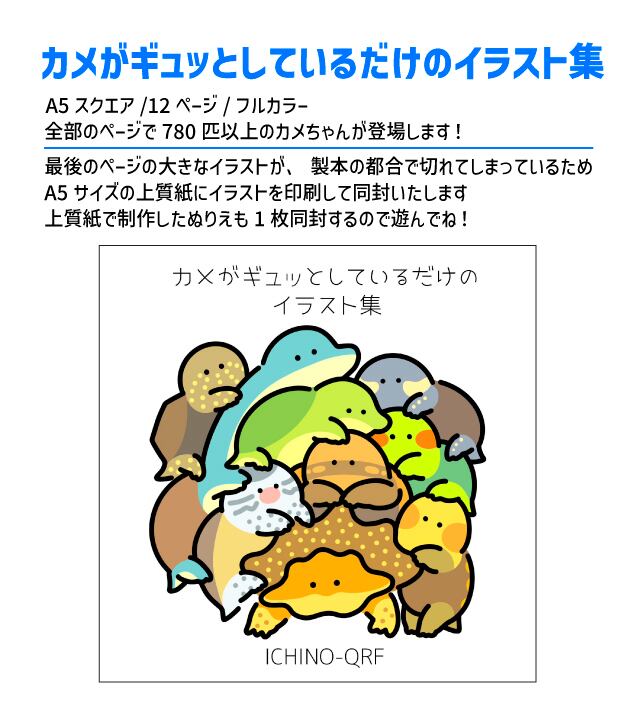 ページをめくるたびに、カメがぎゅうぎゅう集まって登場するイラスト集。